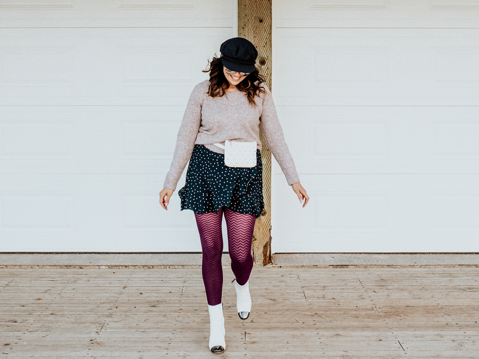 Grab your Textured Plum Chevron Tights and start mixing and matching around this hue. With plum tights, neutrals or pastels make a perfect match. After all, pastels have been all the rage the last couple of seasons and this season is no different. As spring is still on the colder side, I opted for a sweater to keep warm. Finally, I also went for a navy bottom to complement both my top and tights.