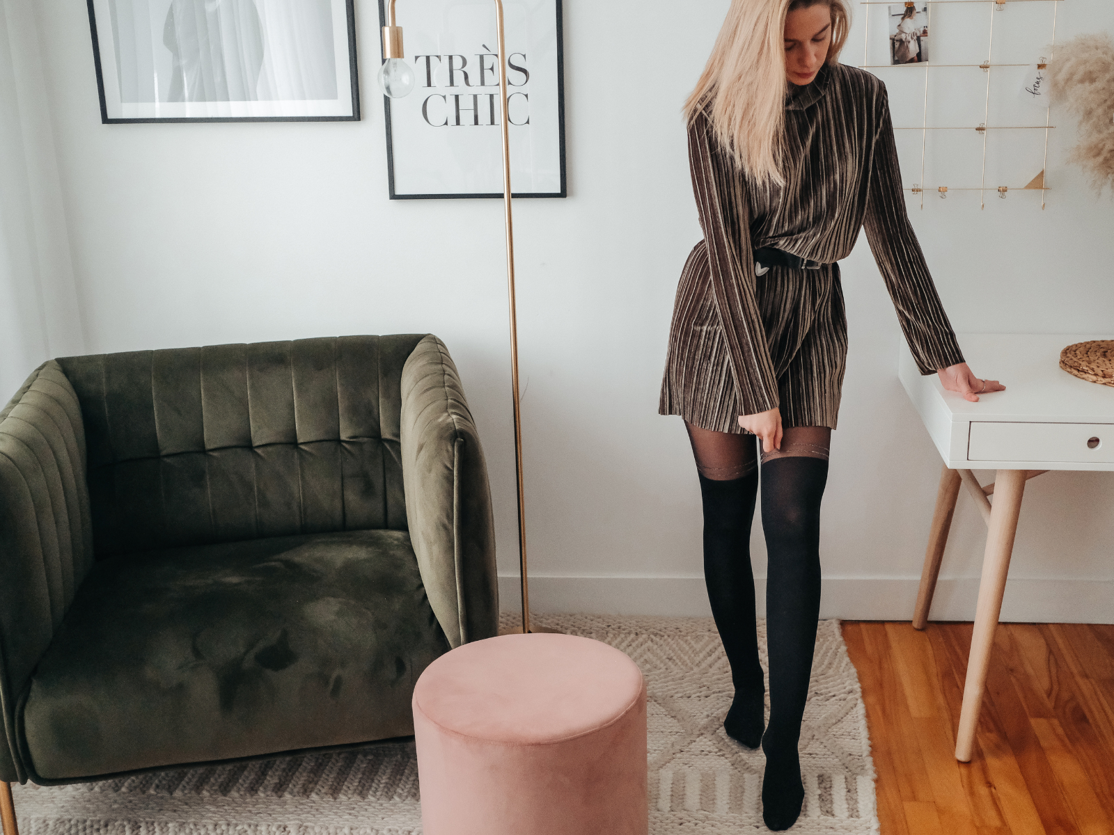 Ultra tendance, la robe à effet velours semi-lustrée est vraiment partout cette saison et elle est vite devenue un incontournable dans ma garde-robe. Avec le collant scintillant, ta tenue est parfaite pour un bon souper du temps de Fêtes avec ta famille.